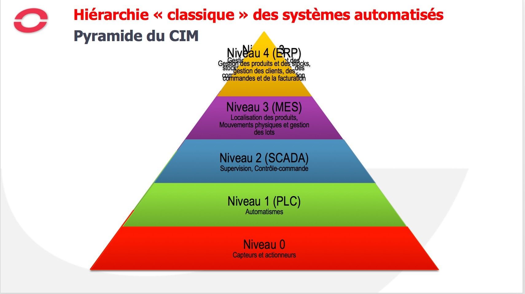 Les SCADA apparaissant vers le haut des automatismes, il était tentant d’introduire un niveau supplémentaire, ce qui donne la pyramide suivante, qui est aujourd’hui la plus souvent représentée. Dans cette pyramide, le niveau 2 est occupé par le SCADA, le niveau 3 est occupé par le MES, et le niveau 4 par l’ERP, ce qui est cohérent avec la hiérarchisation ISA- 95.